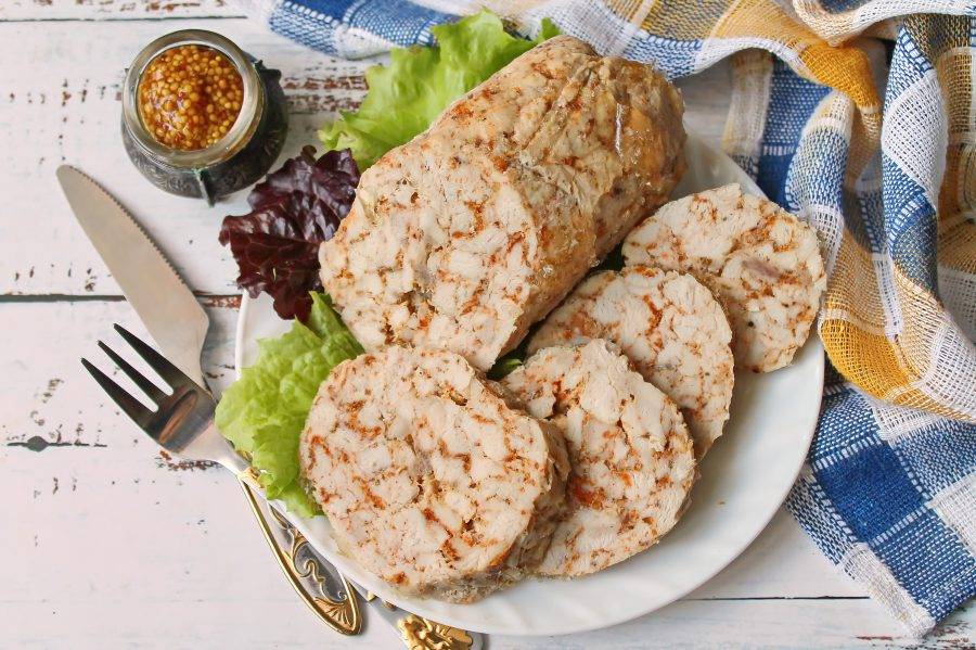 Вымойте куриное мясо, обсушите и мелко нарежьте. Выложите в глубокую миску. Очистите чеснок и измельчите. Добавьте к курице. Посолите, дополните специями и всыпьте желатин. Все тщательно перемешайте до однородности и оставьте на полчаса.