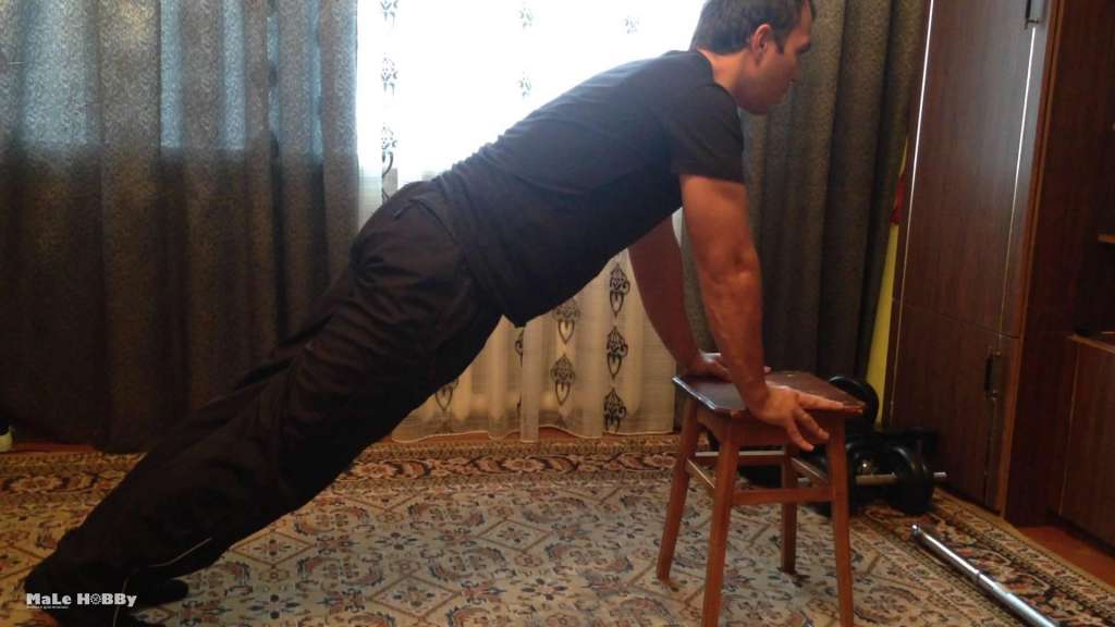 С помощью отжиманий на табуретках можно качественно начать развитие мышц. Для этого надо найти в доме две равные по высоте табуретки, расположить их на ширине рук, которые находятся в вытянутом положении. Далее сделать упор на них руками, присогнутыми в локтях, принять характерную позицию для отжиманий. Ещё сильный эффект возможно получить, разместив ноги на диване/кресле. Число подходов 4, отжиманий от 10 до 20. Техника отжимания: опуститься на руках нужно максимально низко. Чем ниже уровня табуреток, тем лучше. Не стоит спешить и увеличивать количественный показатель, если предложенная схема даётся легко. Оптимально будет осуществлять отжимания с использованием груза. Перерыв между сетами 2-3 минут, меньше не нужно.