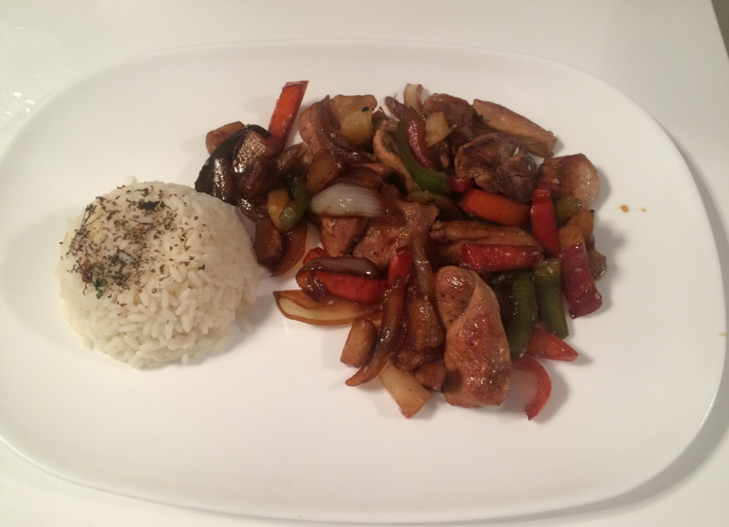 Грудку выкладываем на разогретую сковороду и жарим 5 минут на оливковом масле на сильном огне. Убавляем огонь, к курице добавляем нарезанные овощи, добавляем немного сока из-под ананасов и тушим еще 5 минут. В конце, по желанию, можно добавить крахмал. Чтобы не образовались комочков, крахмал предварительно растворить в небольшом количестве соуса.