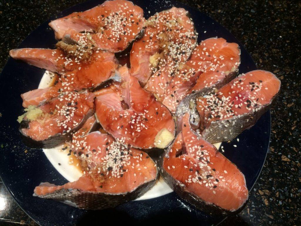 Разделать лосось или другую красную рыбу на проционные куски. Корень имбиря очистить и натереть на терке. Смешать имбирь, соевый соус и оливковое, подсолнечное масло (еще лучше кунжутное масло). Замариновать в этом соусе рыбу хотя бы на 5 минут. Обвалять каждый кусочек в кунжутном семени. Жарить на раскаленной сковороде по 3-4 минуты с каждой стороны.