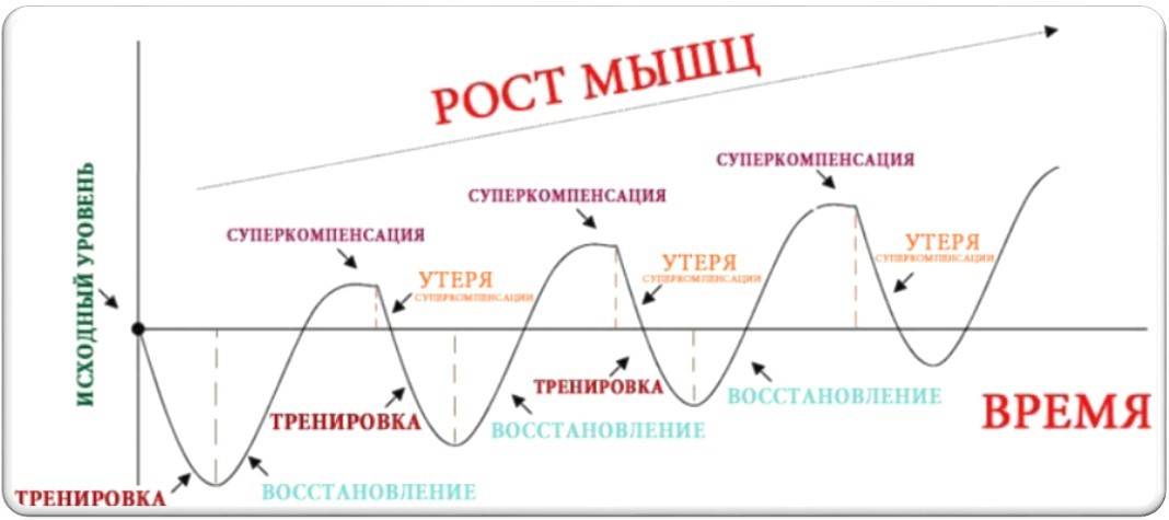 Читайте более развернутую статью о том, как накачать мышцы. В ней подробно рассказано о суперкомпенсации и о том, какие процессы проходят в организме после тренировок и как быстрее достигнуть желаемых результатов. Перейти к статье