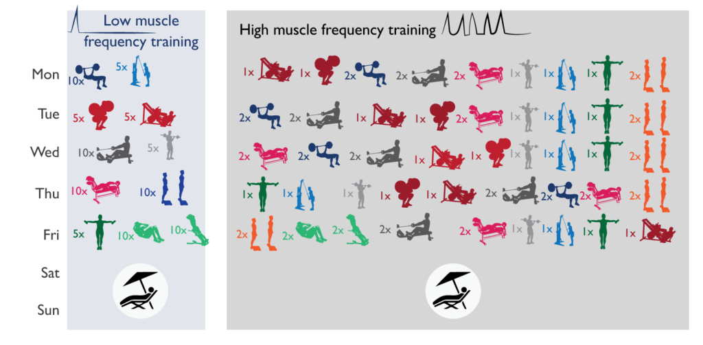 Слева: группа с низкой частотой програботки мышечных групп делала по 2 упражнения, но по 5-10 подходов в каждом. А группа с высокой частотой делала больше упражнений, но лишь по 1-2 подхода в каждом.