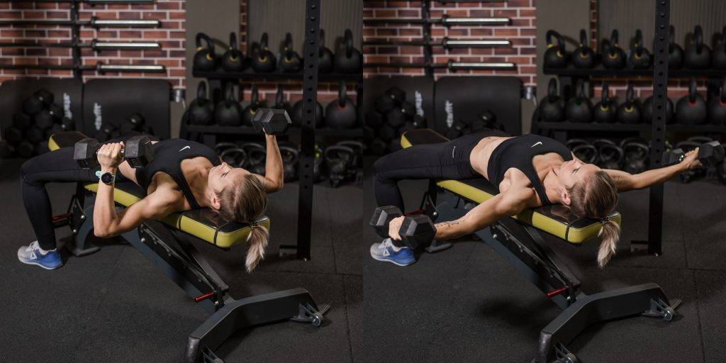 - Разведение гантелей, лежа на лавке под углом, 3 подхода по 15 повторений.