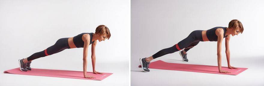 - Проведите эспандер за спиной, возьмите концы в обе руки и встаньте в упор лёжа.