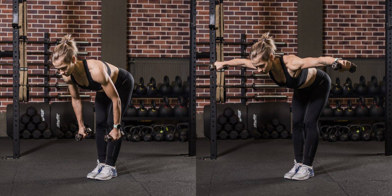 - Отведение гантелей назад — сделать наклон вперед, руки вдоль корпуса. Подводить их к груди, сгибая в локтях, и отводить назад.