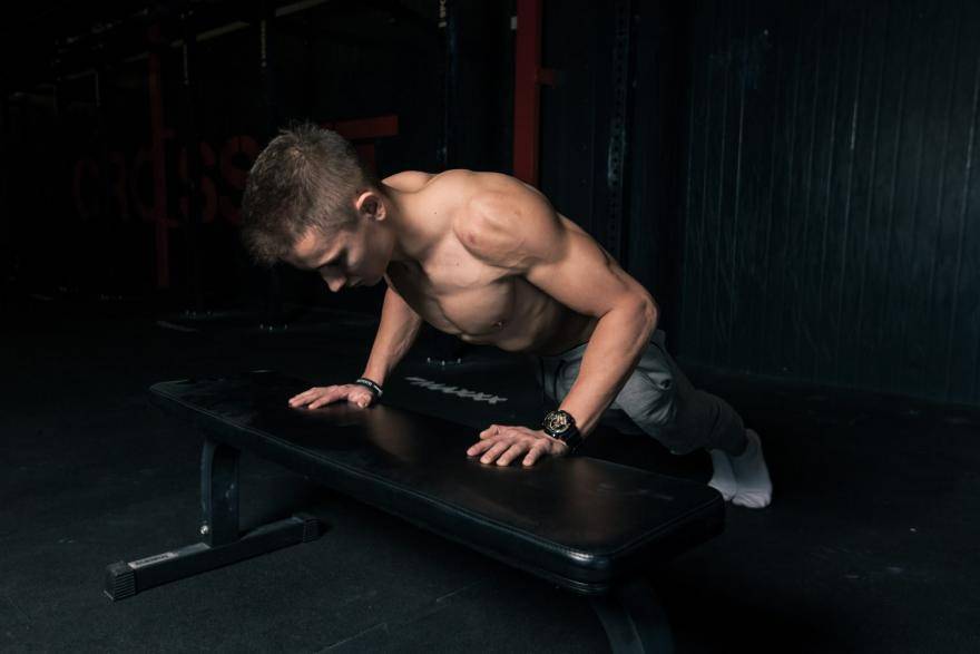 - Расположите руки немного шире ширины плеч на скамейке и ноги на ширине плеч с упором носочками на полу.