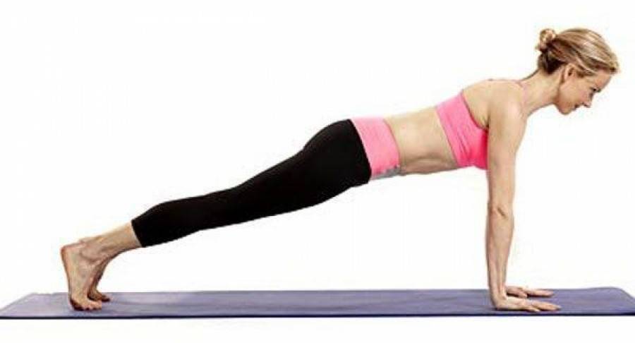 Отлично укрепляет пресс. Примите позицию классической планки. Только руки выпрямите. Ягодицы не должны торчать вверх или быть опущены вниз. Позицию спины старайтесь сохранять в ровном положении, не прогибаясь в области поясницы. Зафиксируйте положение на 15-60 секунд.