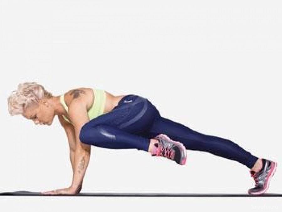 С подтягиванием коленей. Исходная стойка – с упором на предплечья или ладони. Притяните правое колено через сторону к правому плечу. Затем повторите действие с левым коленом. Сделайте несколько повторов, чередуя ноги.
