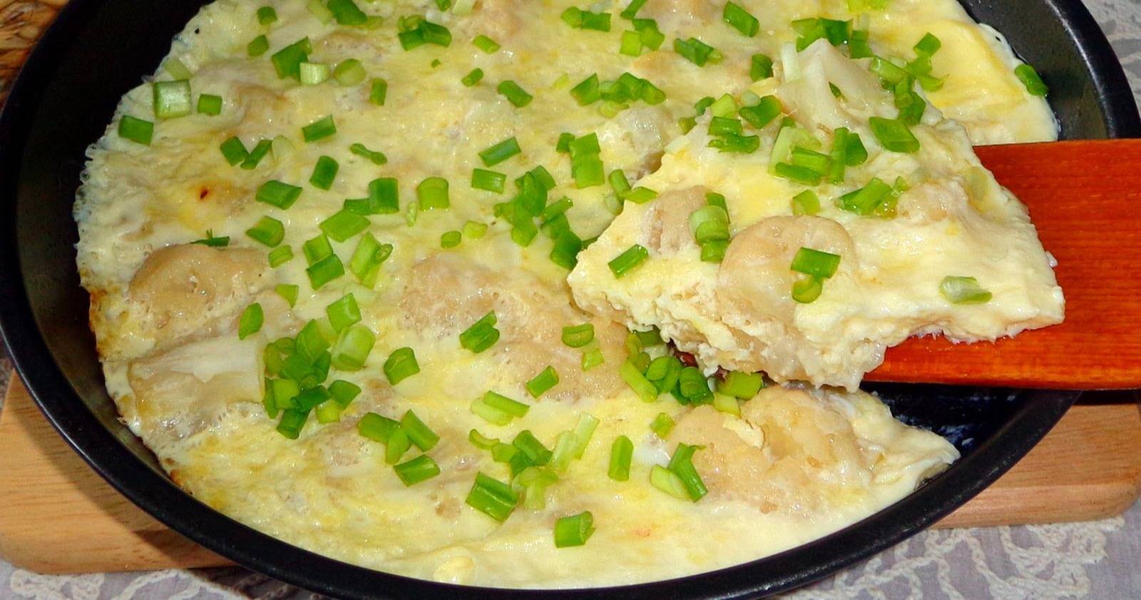- Смешать венчиком в емкости 3 яйца, столовую ложку муки, соль, специи. Добавить мелко порезанный зеленый лук.