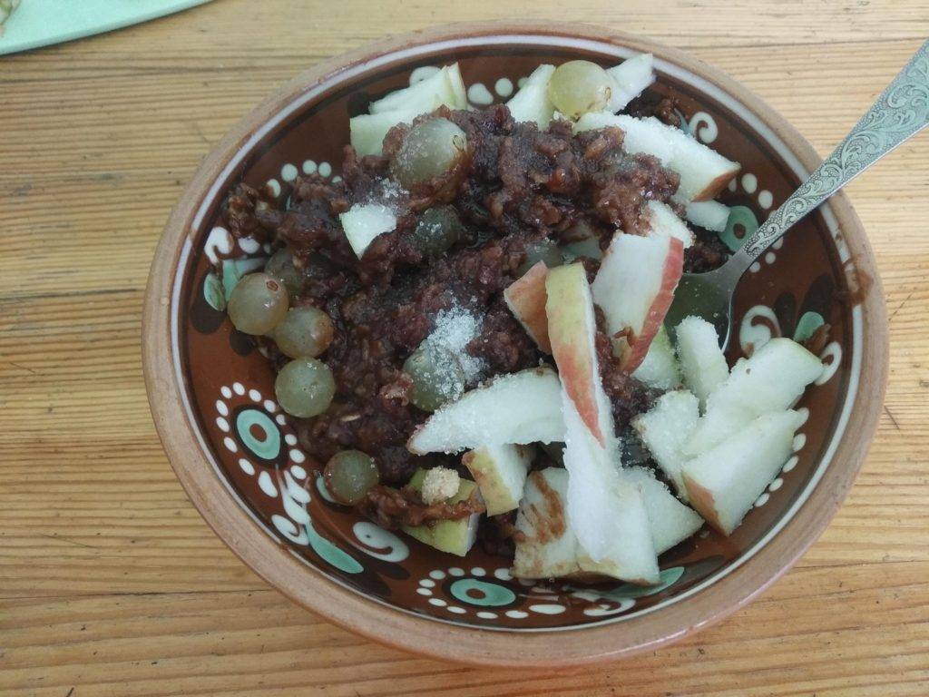 Требуется: 1 стакан тертой моркови, 300 г молока, 1 стакан овсяных хлопьев, по щепотке молотого имбиря и мускатного ореха, по 0,5 ч. л. корицы и ванили, 100 г измельченных орехов, 2 ст. л. кокосовой стружки, 2 ст. л. сахара, 50 г изюма, 1 ч. л. лимонного сока.